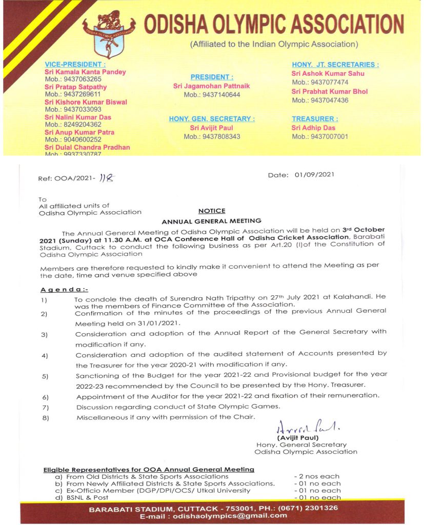The Annual General Meeting of Odisha Olympic Associalion will be held on 3rd October 2021 (Sunday) at 11 .30 A .M . at OCA Conference Hall of Odlsha Cricket Association.