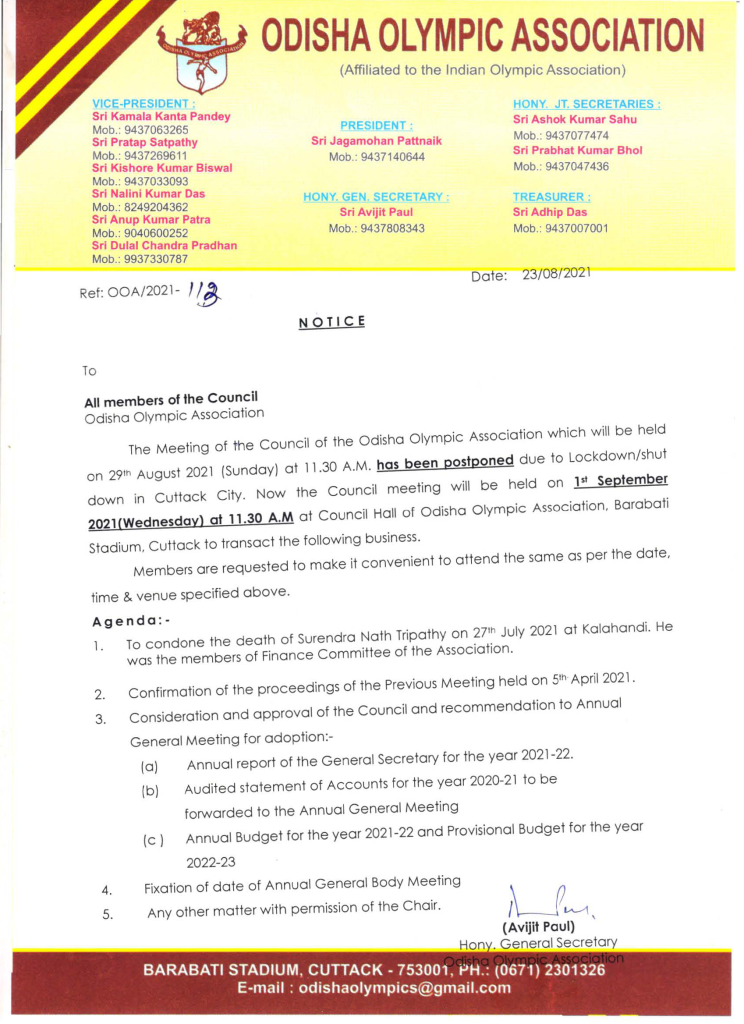 The Meeting of the council of the Odisha Olympic Association has been postponed due to lockdown/shutdown in cuttack city.